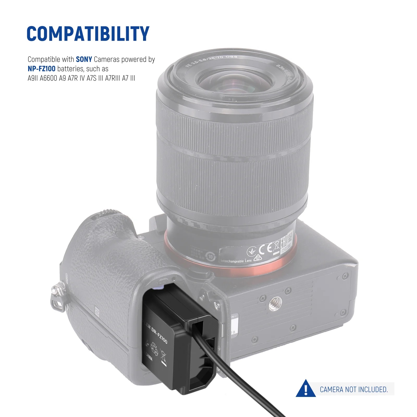Sustituye la batería NP-FZ100 para proporcionar una fuente de alimentación continua, permitiendo sesiones largas sin interrupciones y un flujo de trabajo más eficiente.