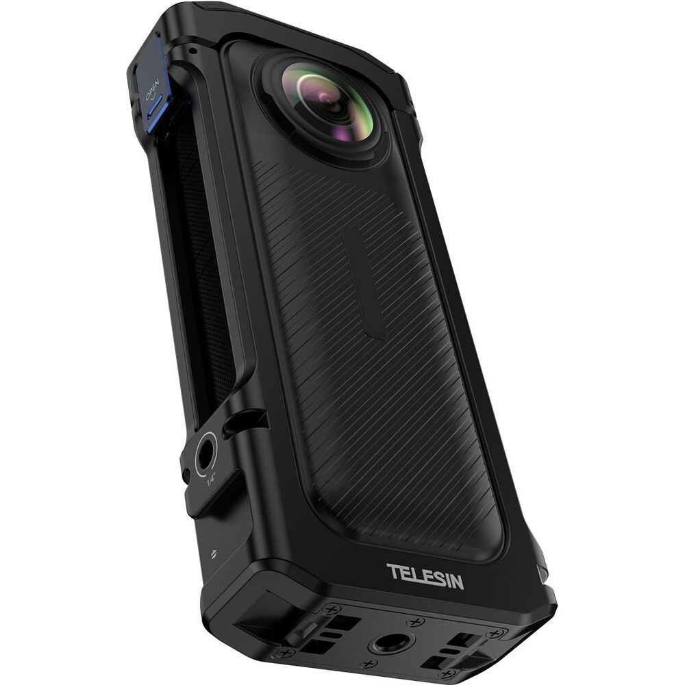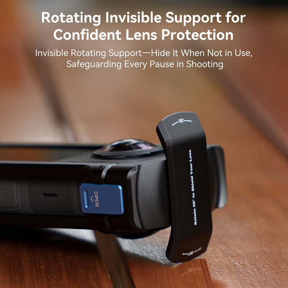 Ofrece una estructura robusta que protege la cámara contra golpes y rayones sin obstruir botones, puertos ni funciones esenciales; su acabado en metal negro aporta mayor resistencia y una apariencia profesional, mientras que el sistema superior giratorio permite, con un cuarto de vuelta, cubrir el lente cuando la cámara está apoyada sobre una superficie, ayudando a prevenir daños accidentales y manteniéndola siempre lista para grabar.