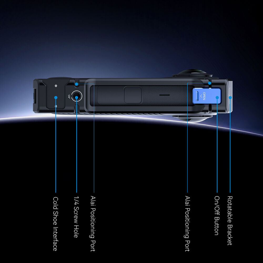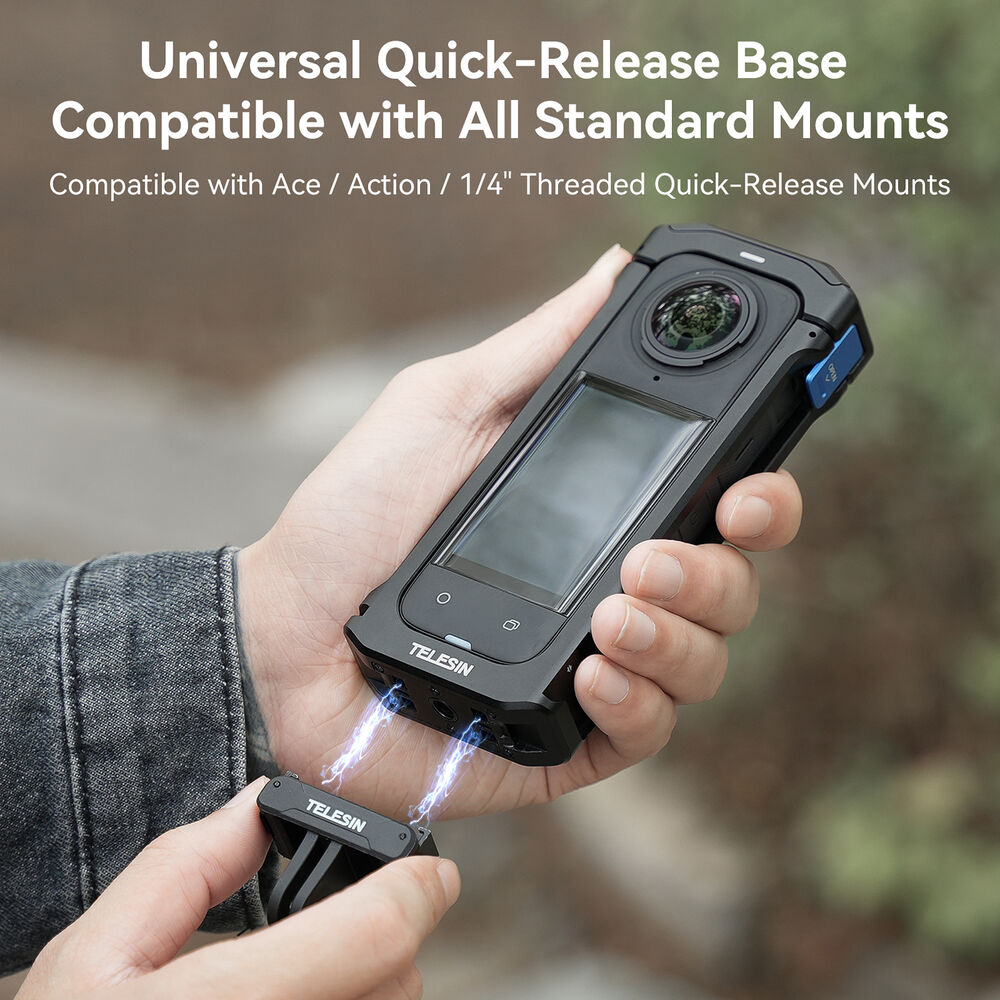 Incorpora una zapata cold shoe y dos roscas estándar de 1/4”, facilitando la instalación de micrófonos, luces LED, empuñaduras u otros accesorios. Esto convierte la Insta360 X4 en una plataforma más versátil para grabaciones dinámicas y producciones más completas.