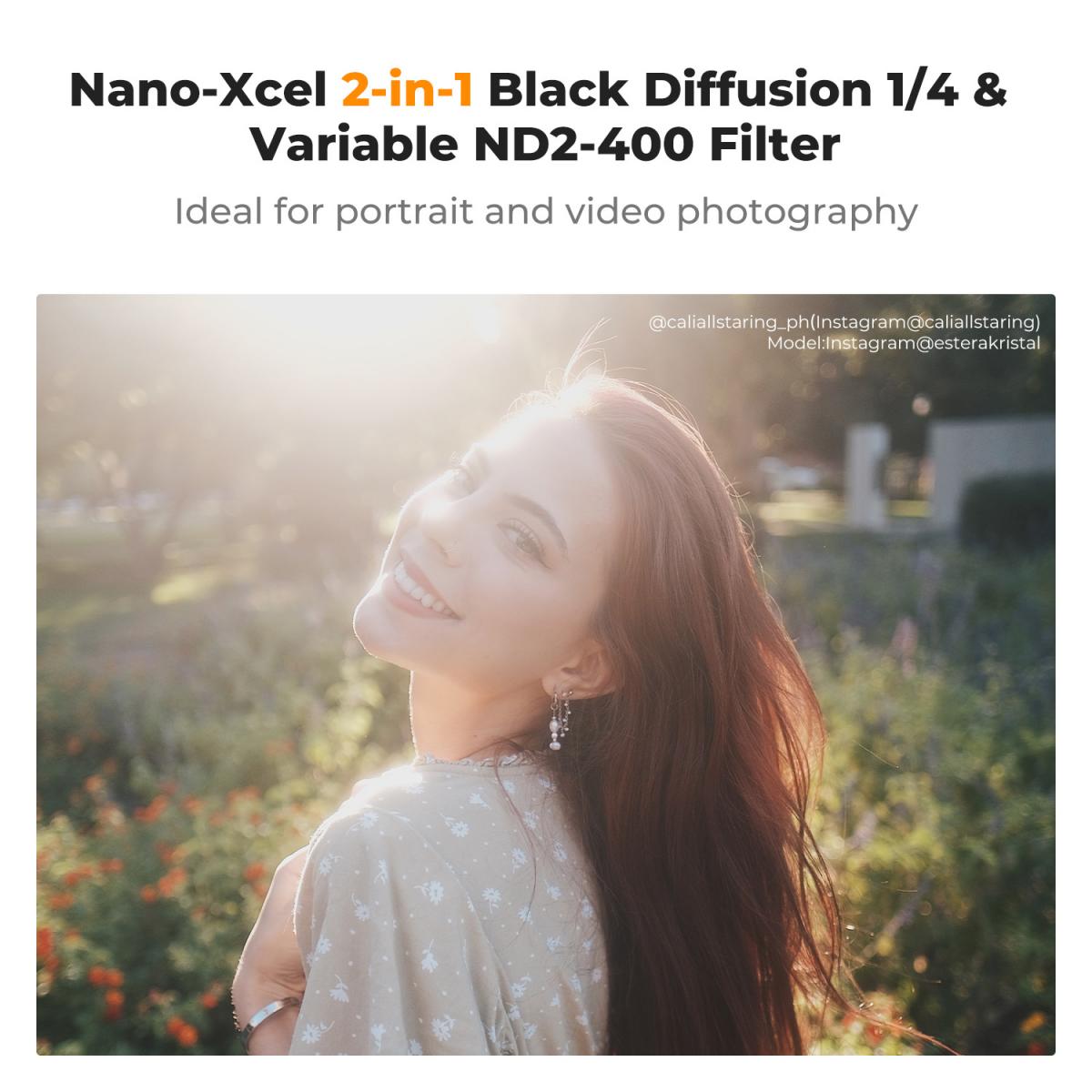 Un solo filtro que combina reducción de luz (ND variable) y efecto de difusión negra. Permite controlar la exposición y, al mismo tiempo, suavizar las altas luces, reducir el contraste y crear un efecto visual más cinematográfico y etéreo tanto en fotografía como en video.