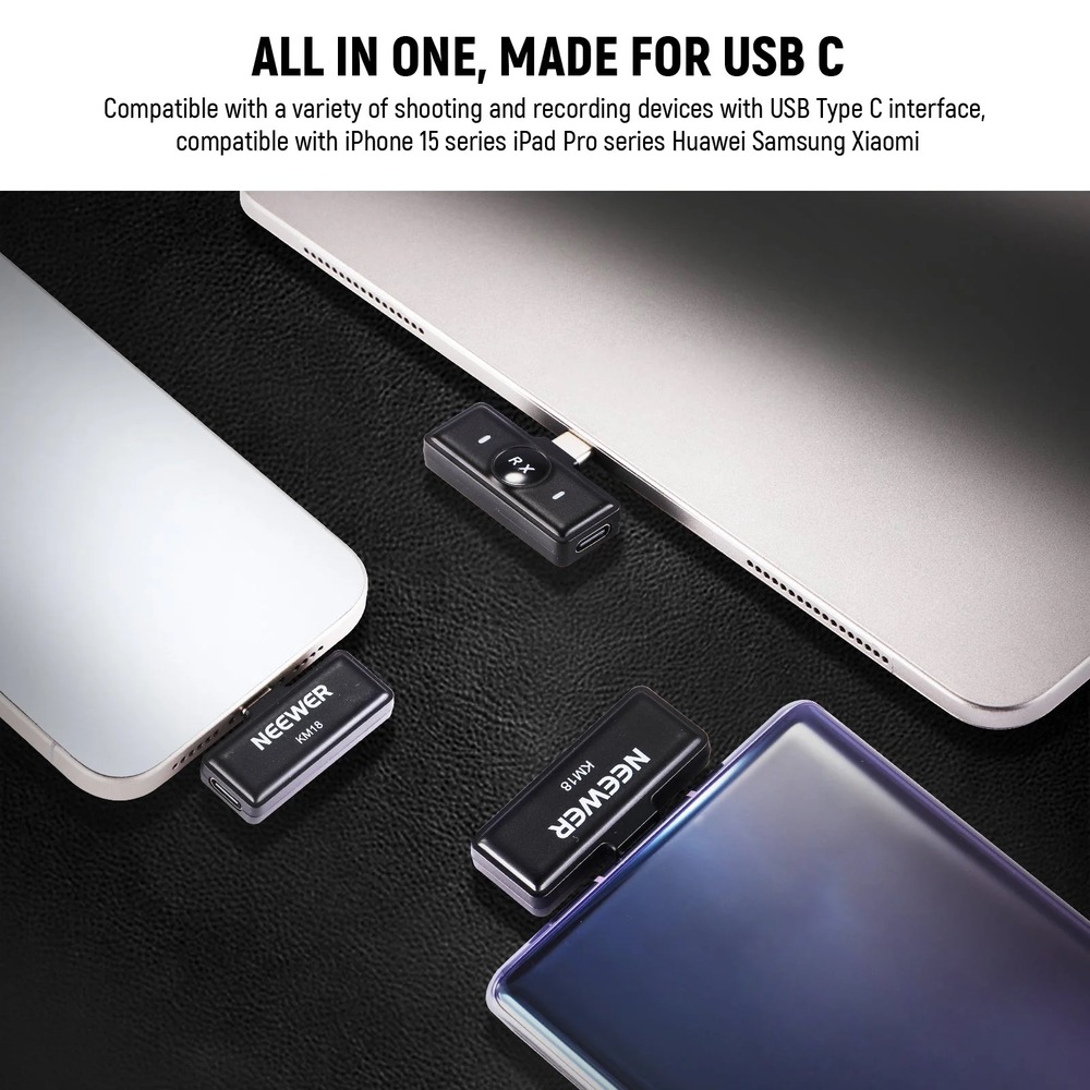 La versión USB-C está diseñada para funcionar con smartphones Android, iPhone 15, cámaras de acción y computadoras con puerto tipo C. El transmisor (TX) y el receptor (RX) se emparejan automáticamente al encenderse, y el receptor se conecta directamente al dispositivo sin necesidad de Bluetooth ni aplicaciones adicionales, garantizando una experiencia rápida y sin complicaciones.