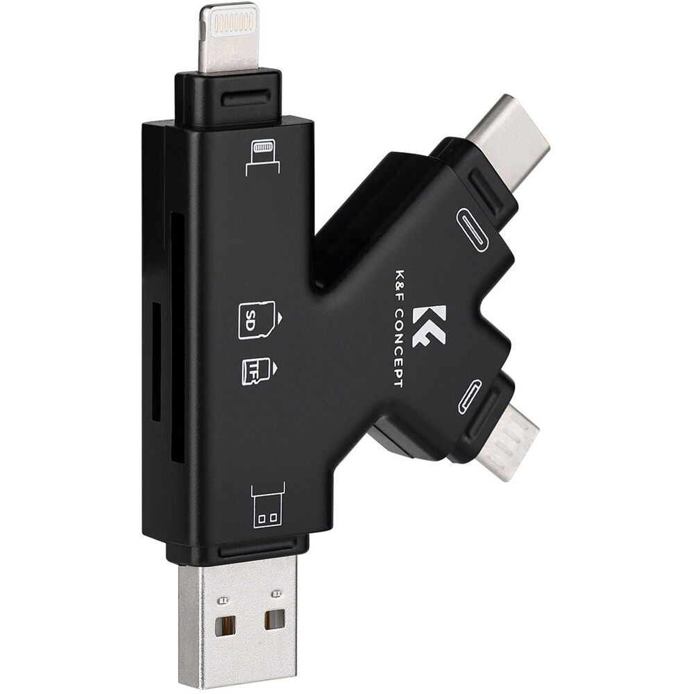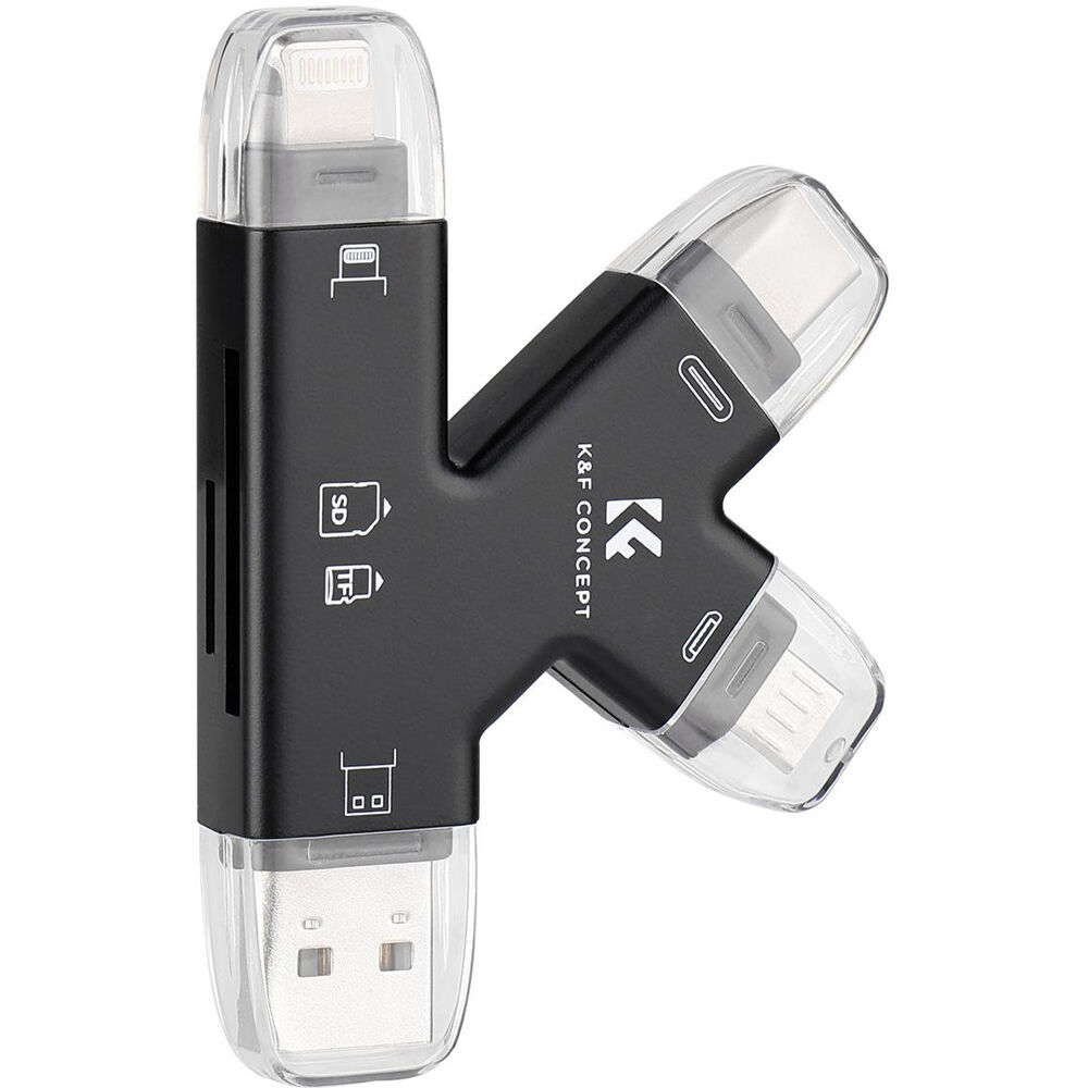 Este lector de tarjetas multifuncional integra interfaces USB, USB Tipo C, Micro USB, ranura para tarjeta SD, ranura para Micro SD y puerto de carga para dispositivos iOS como iPhone y iPad, permitiendo transferir archivos fácilmente entre distintos dispositivos sin necesidad de equipos adicionales.