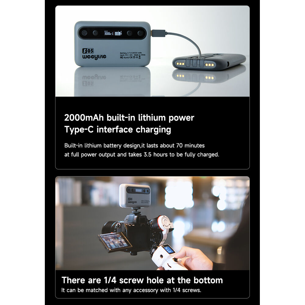 Cuenta con una batería interna recargable de 2000 mAh que ofrece hasta 1.5 horas de uso continuo al máximo brillo, con carga sencilla mediante puerto USB-C. Incorpora una rosca estándar de 1/4” para montaje en trípodes o soportes, además de un sistema magnético que facilita opciones de montaje rápidas y creativas.