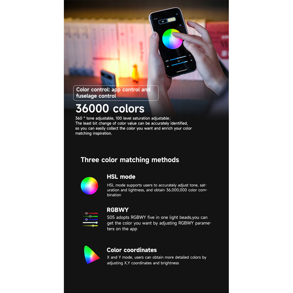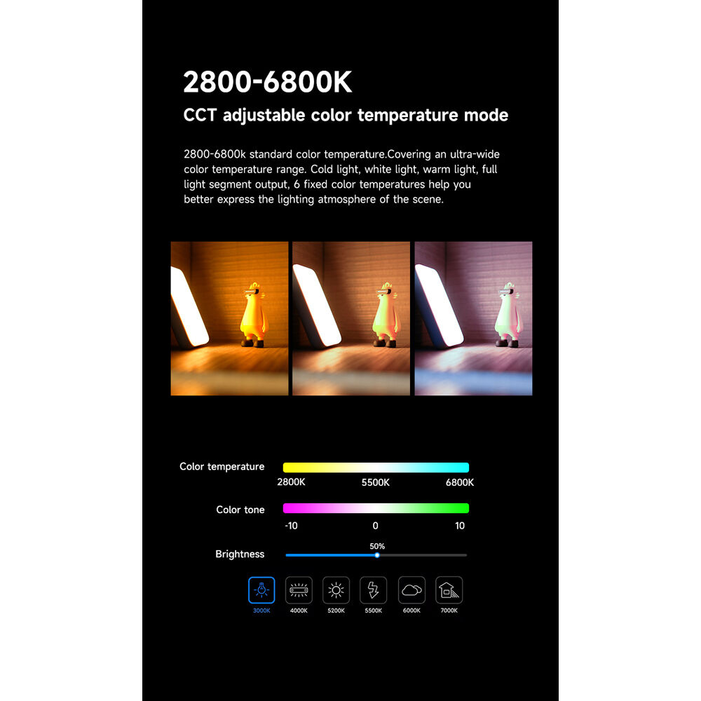 Ofrece iluminación RGB completa con 360 colores ajustables y una temperatura de color variable entre 2800K y 6800K, permitiéndote crear ambientes personalizados y efectos visuales con total libertad creativa. Incorpora además 20 modos de iluminación especiales como flash, pulso y otros efectos dinámicos que aportan carácter y movimiento tanto en fotografía como en video.