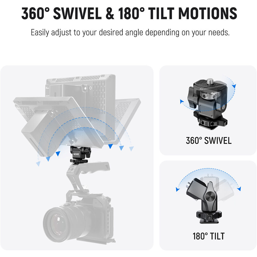 Diseñado para monitores de campo de 5” a 7”, ideal para vlogging profesional, cine y fotografía. Compatible con zapata de cámara y cages SmallRig. El tornillo moleteado permite una instalación rápida y segura sin herramientas.