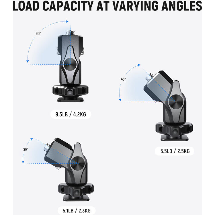 La capacidad de carga varía según el ángulo de inclinación: hasta 4.2 kg a 90°, 2.5 kg a 45° y 2.3 kg a 30°, garantizando estabilidad y seguridad en diferentes configuraciones.