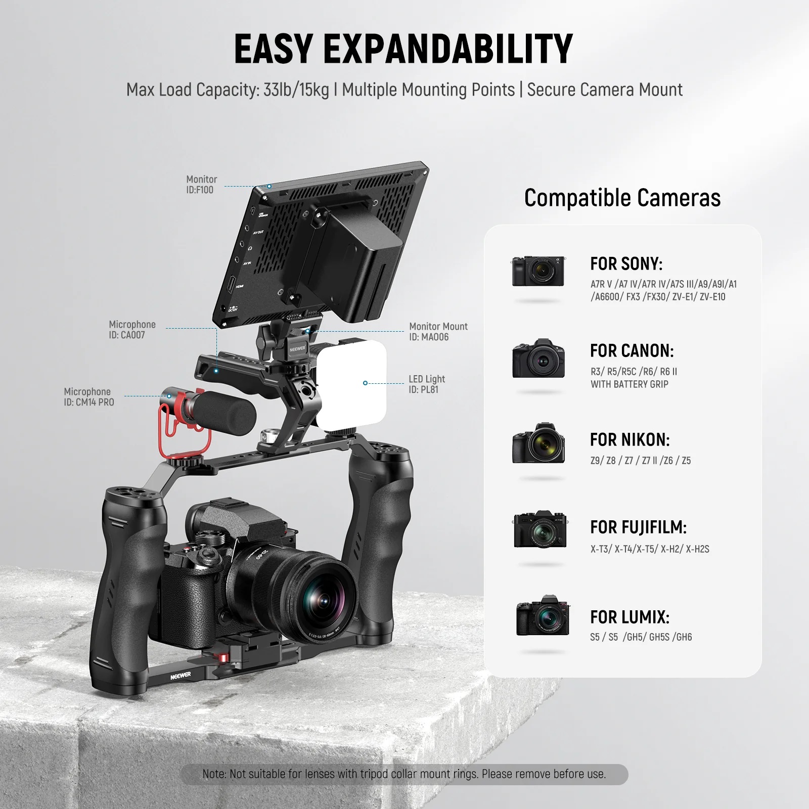 Diseñada para creadores que graban en movimiento, esta jaula ofrece control, estabilidad y libertad total para expandir su cámara con accesorios profesionales, sin sacrificar comodidad ni rapidez.