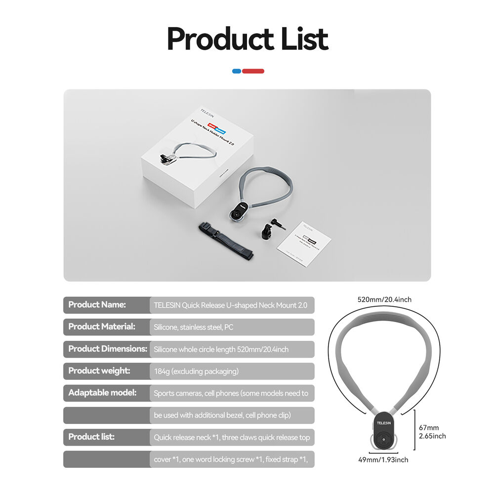 El soporte de cuello está diseñado para funcionar con una amplia variedad de cámaras deportivas y también puede utilizarse con teléfonos inteligentes mediante un clip para teléfono (se vende por separado). Su estructura ligera soporta equipos de hasta 300 g aproximadamente, ofreciendo una solución práctica para grabación en movimiento.